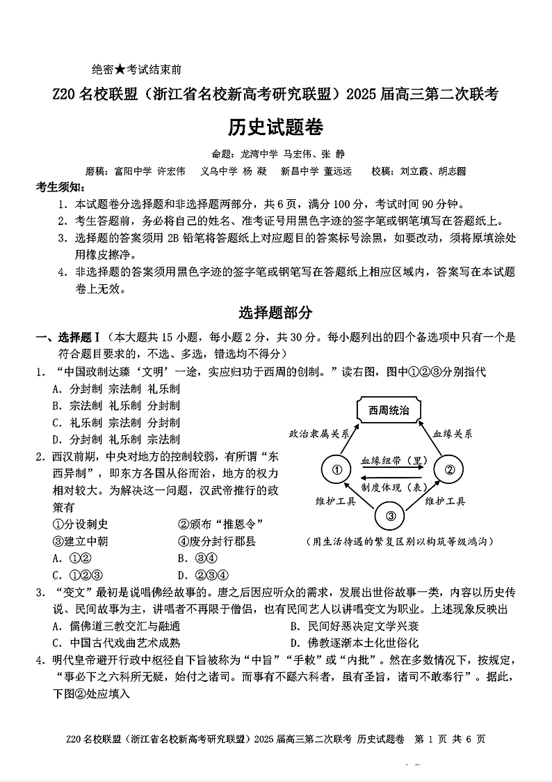 浙江省Z20名校联盟2025届高三上学期第二次联考历史