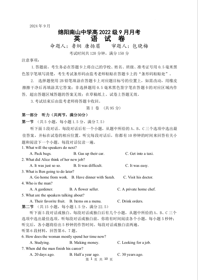 四川省绵阳市南山中学2024级秋季高2022级9月月考英语