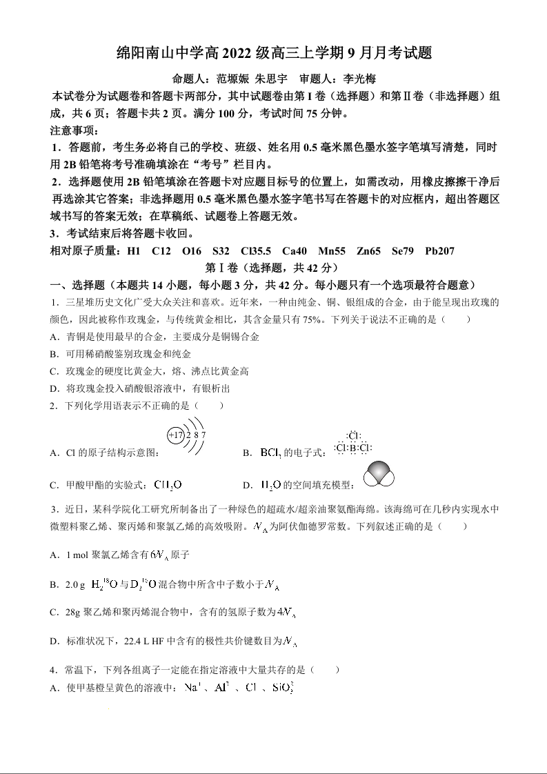 四川省绵阳市南山中学2024级秋季高2022级9月月考化学+答案