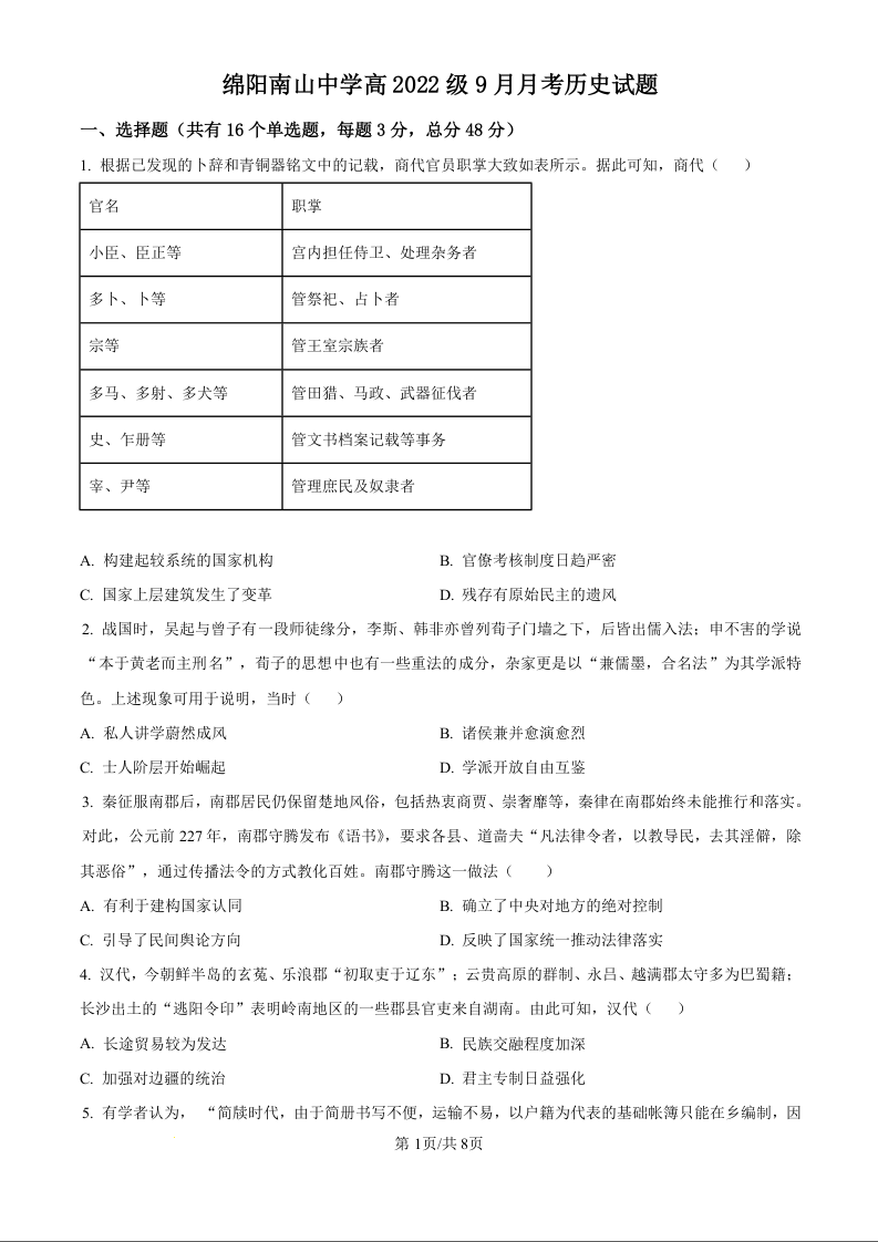 四川省绵阳市南山中学2024级秋季高2022级9月月考历史试题(原卷版)