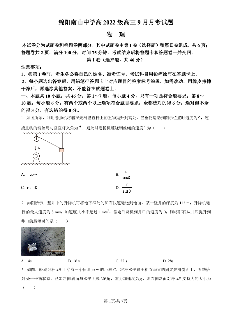 四川省绵阳市南山中学2024级秋季高2022级9月月考物理试题(原卷版)