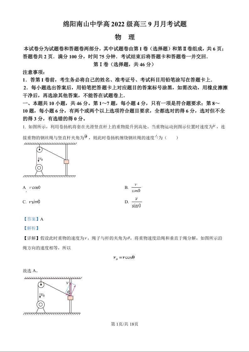 四川省绵阳市南山中学2024级秋季高2022级9月月考物理试题(解析版)