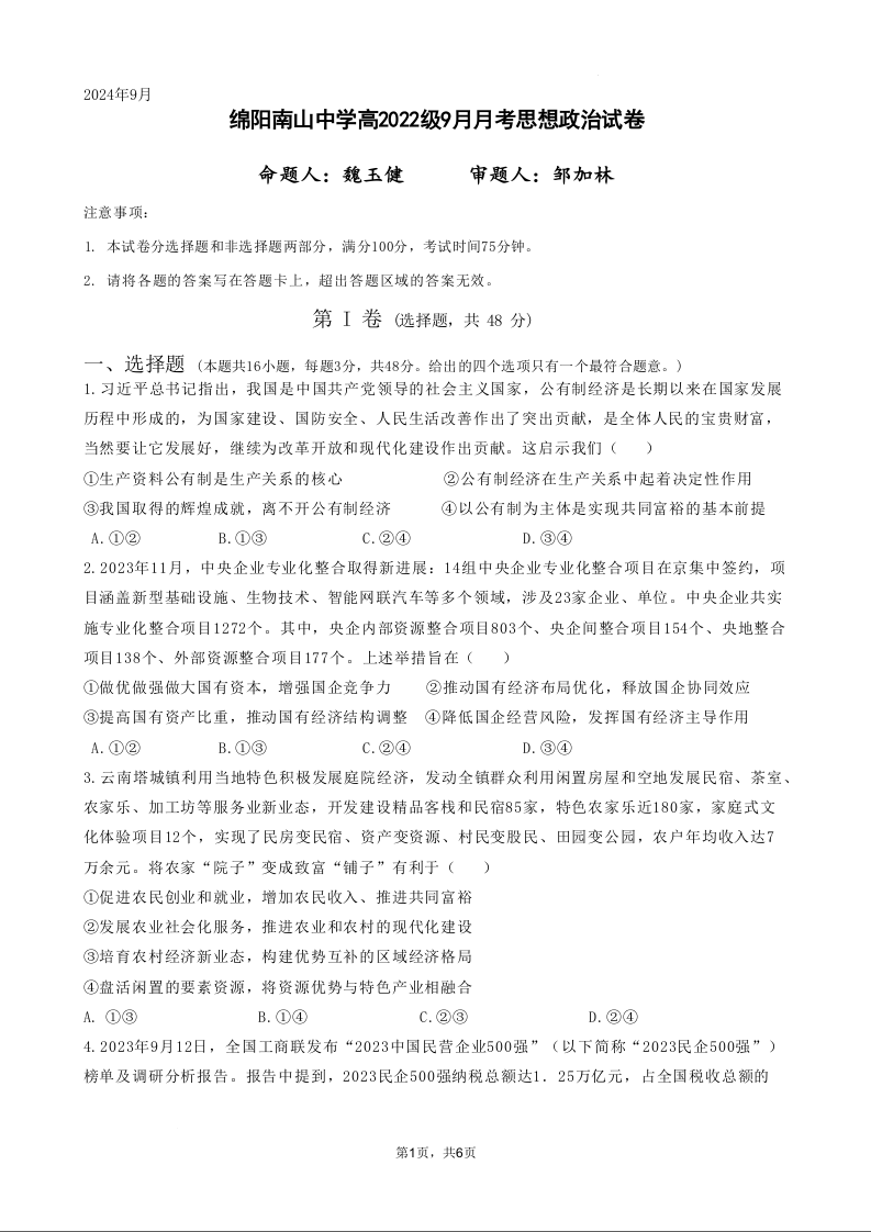 四川省绵阳市南山中学2024级秋季高2022级9月月考政治