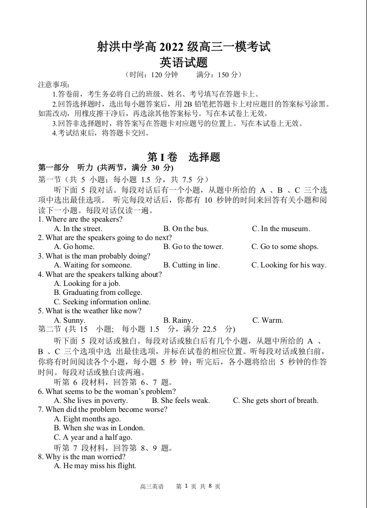 四川省遂宁市射洪中学高2022级高三一模考试英语