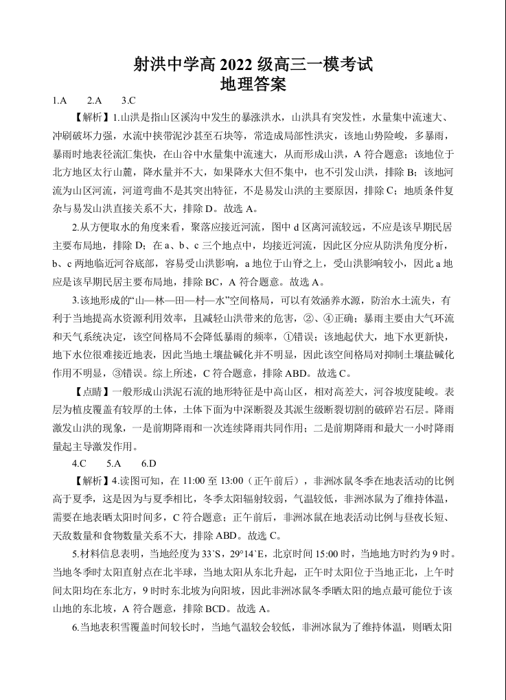 四川省遂宁市射洪中学高2022级高三一模考试地理答案