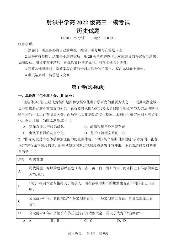 四川省遂宁市射洪中学高2022级高三一模考试历史