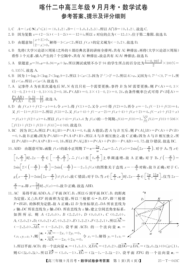 新疆维吾尔自治区喀什第二中学2025届高三9月份月考数学答案