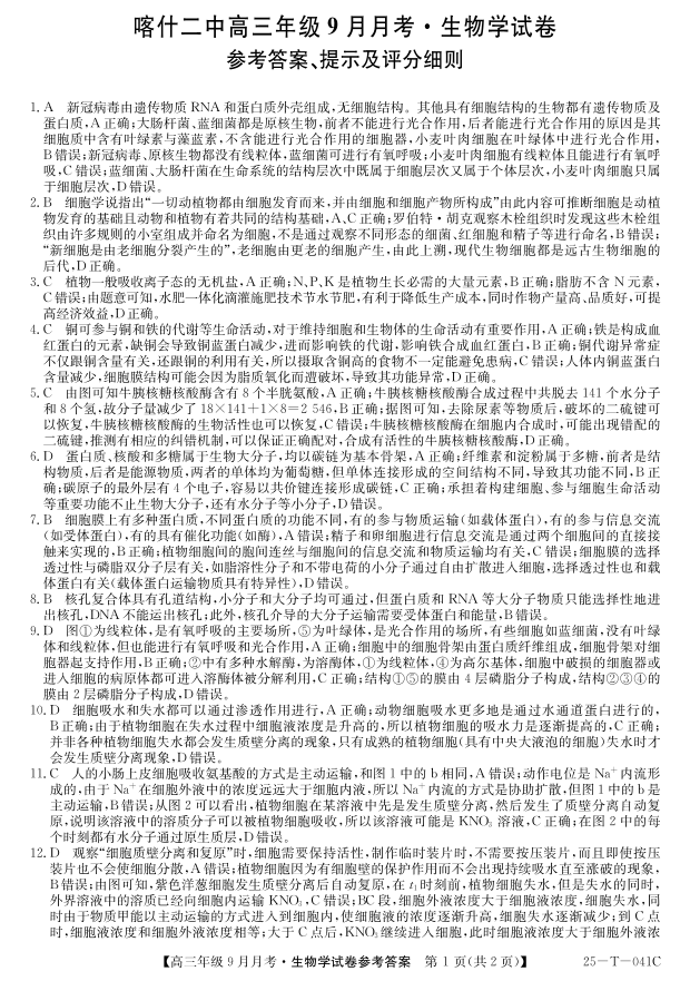 新疆维吾尔自治区喀什第二中学2025届高三9月份月考生物答案