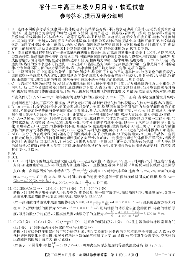 新疆维吾尔自治区喀什第二中学2025届高三9月份月考物理答案