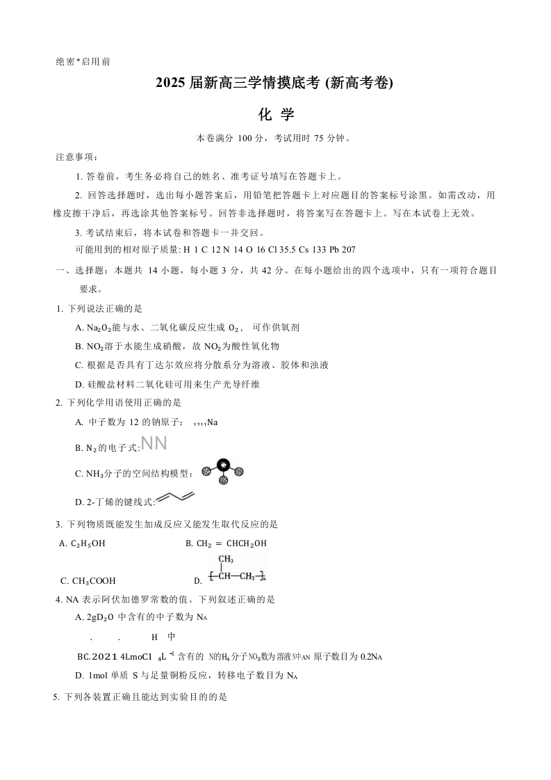 2025届新高三9月学情摸底考化学+答案