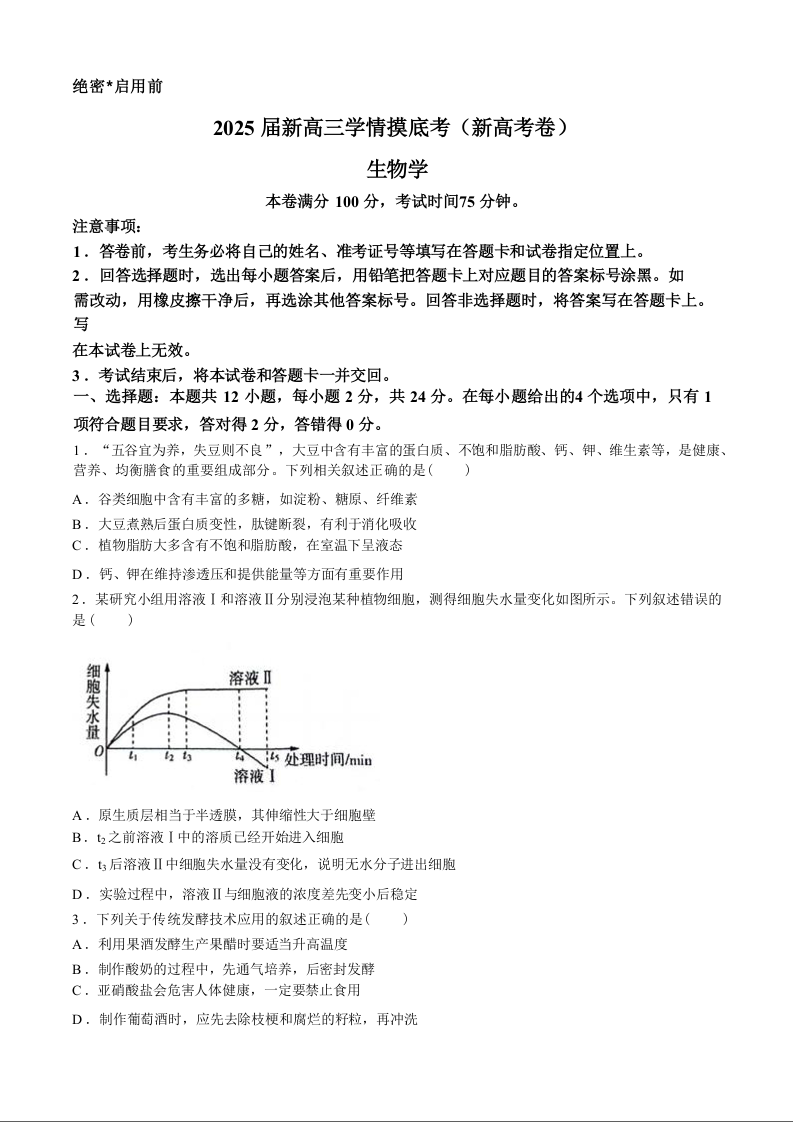 2025届新高三9月学情摸底考生物+答案