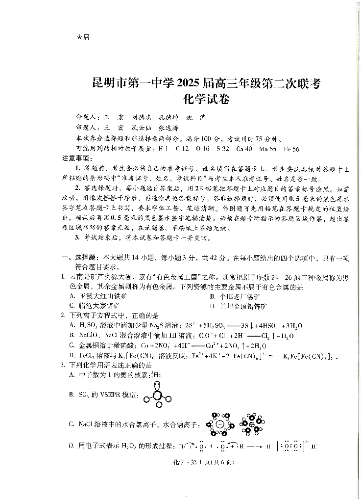 云南省昆明市第一中学2025届高三年纪第二次联考化学