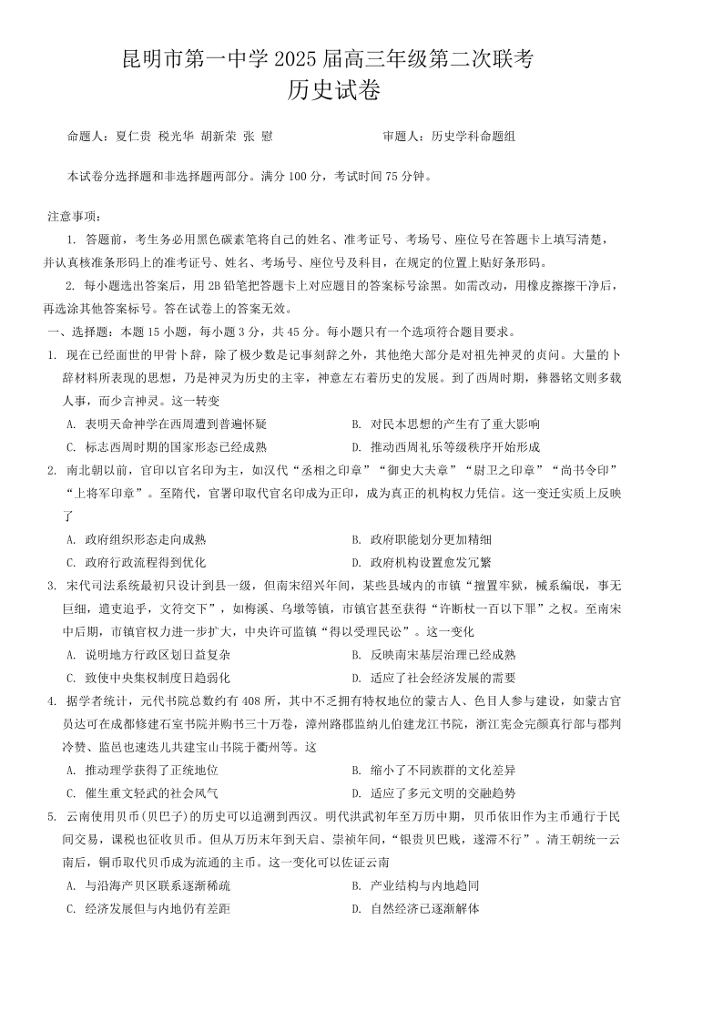 云南省昆明市第一中学2025届高三年纪第二次联考历史