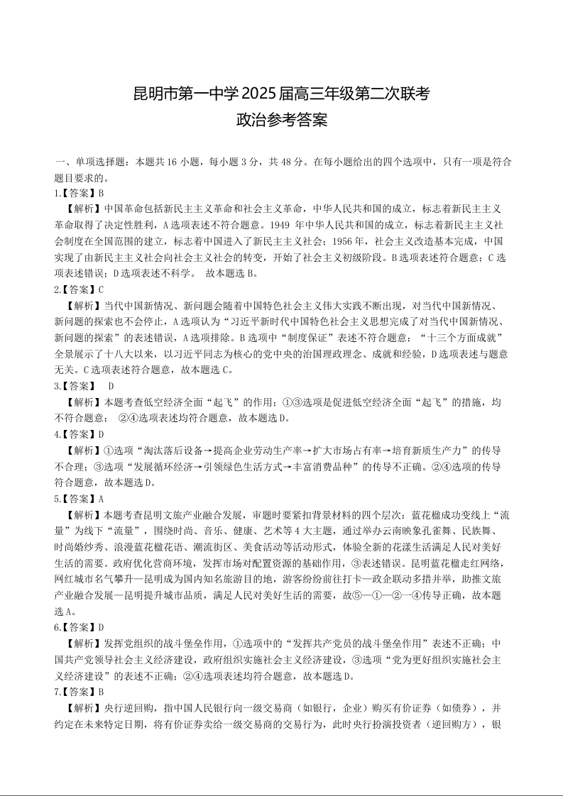 云南省昆明市第一中学2025届高三年纪第二次联考政治答案