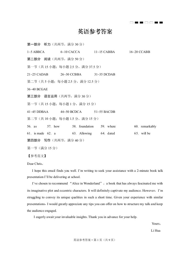 重庆市巴蜀中学2025届高考适应性月考卷(一)英语答案