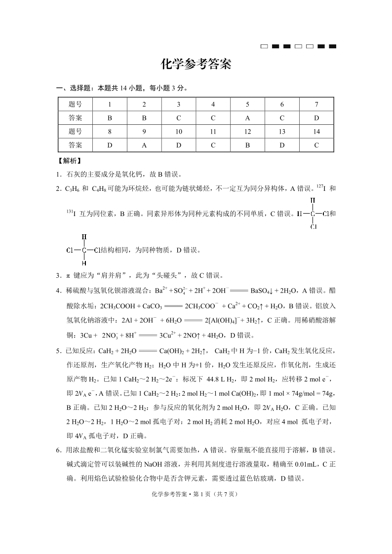 重庆市巴蜀中学2025届高考适应性月考卷(一)化学答案