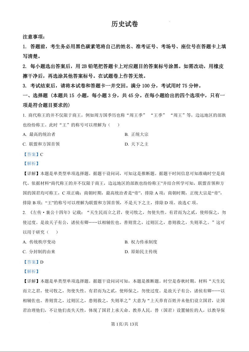 重庆市巴蜀中学2025届高考适应性月考卷(一)历史试卷(解析版)