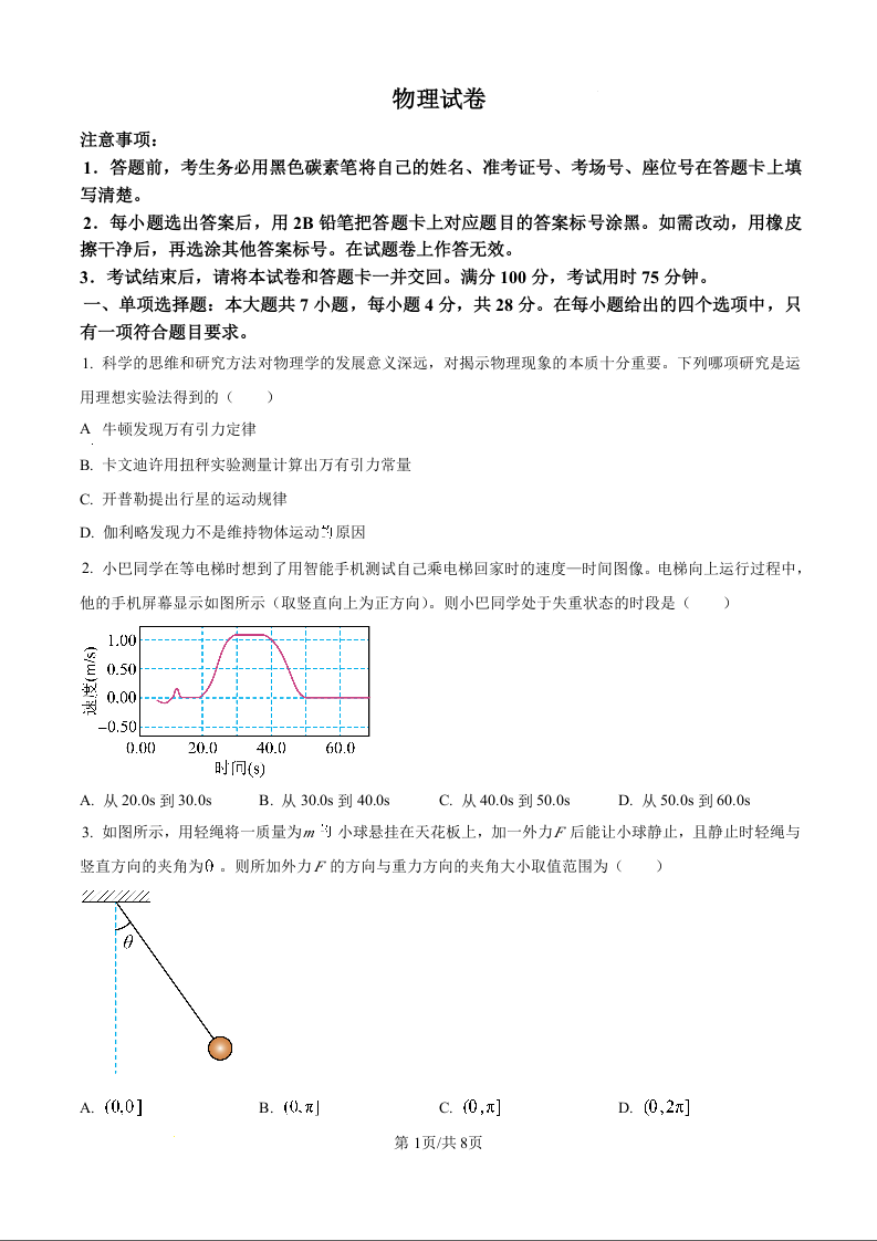 重庆市巴蜀中学2025届高考适应性月考卷(一)物理试题(原卷版)