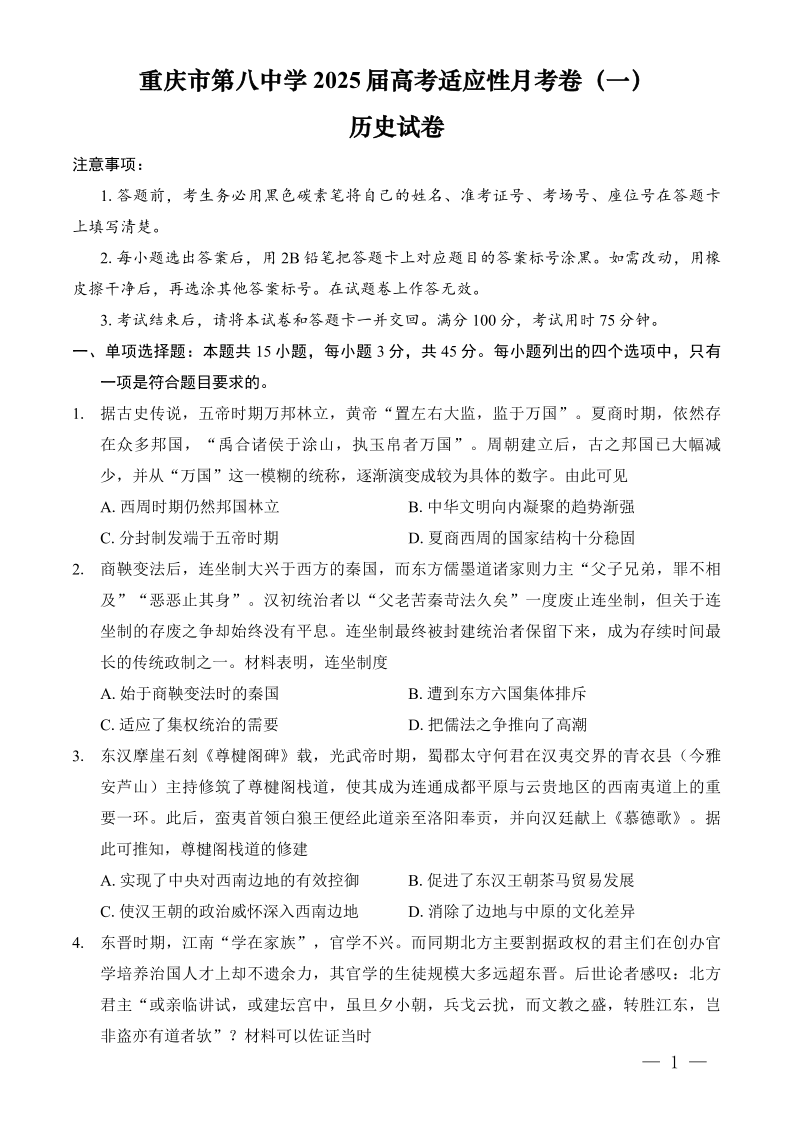 重庆市第八中学2025届高考适应性月考卷(一)历史