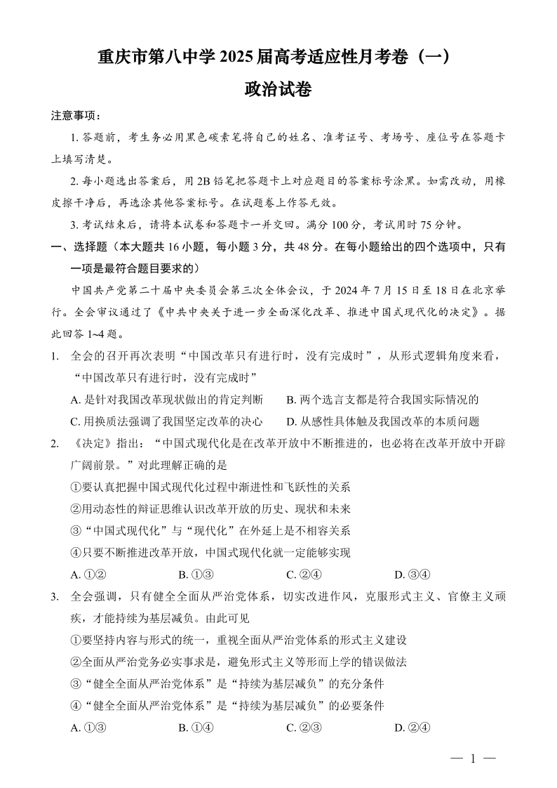 重庆市第八中学2025届高考适应性月考卷(一)政治