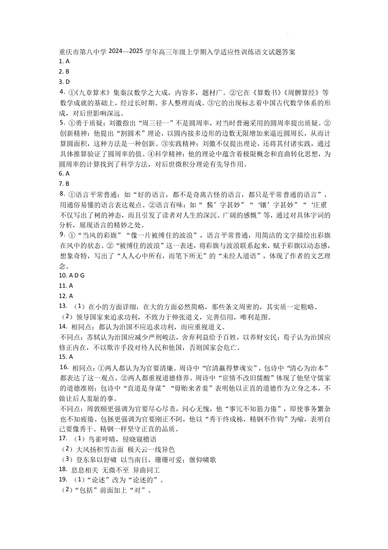 重庆市第八中学校2024-2025学年度(上)高三年级入学适应性训练语文答案