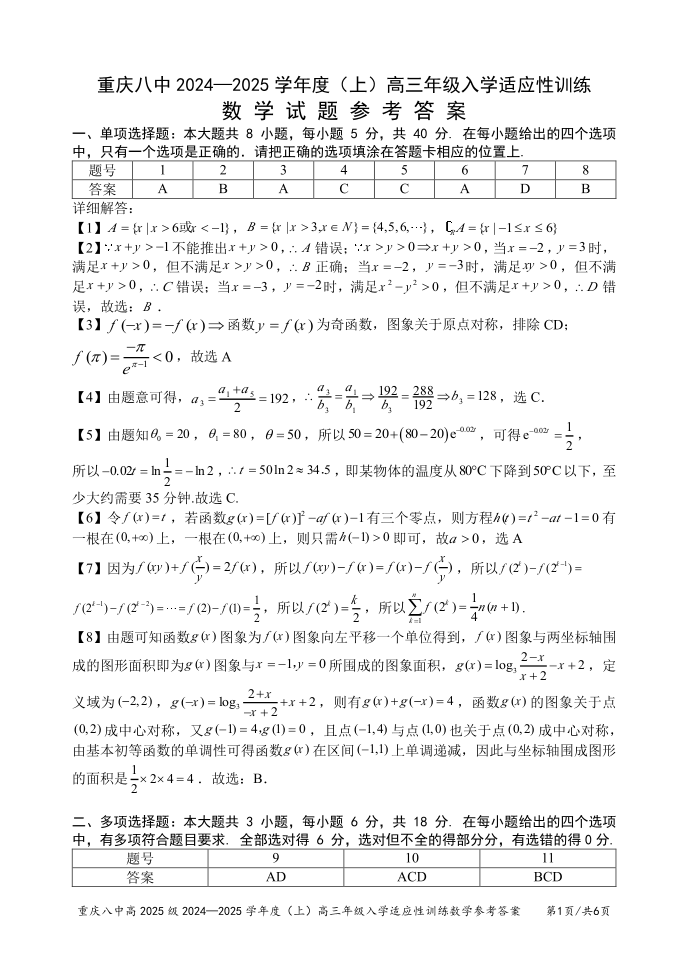 重庆市第八中学校2024-2025学年度(上)高三年级入学适应性训练数学答案
