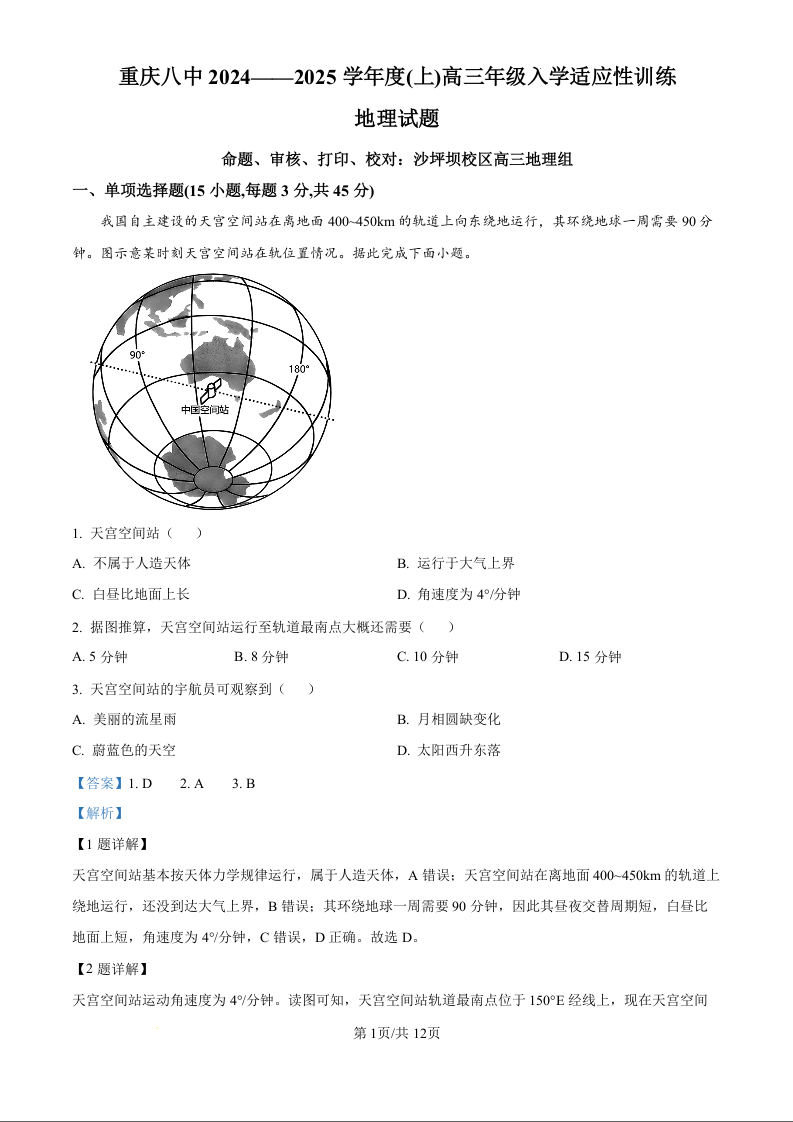 重庆市第八中学校2024-2025学年度(上)高三年级入学适应性训练地理试题(解析版)