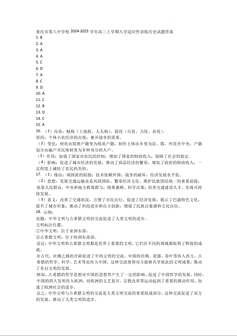 重庆市第八中学校2024-2025学年度(上)高三年级入学适应性训练历史答案