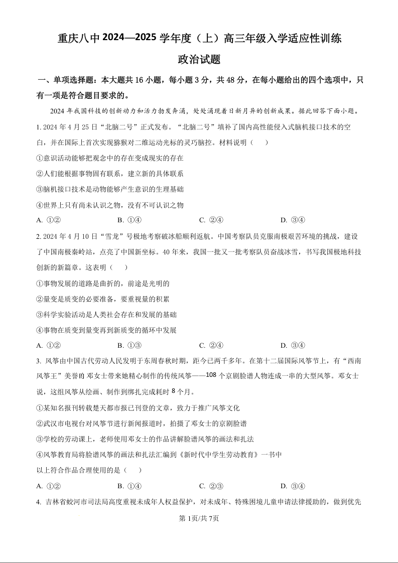 重庆市第八中学校2024-2025学年度(上)高三年级入学适应性训练政治试题(原卷版)