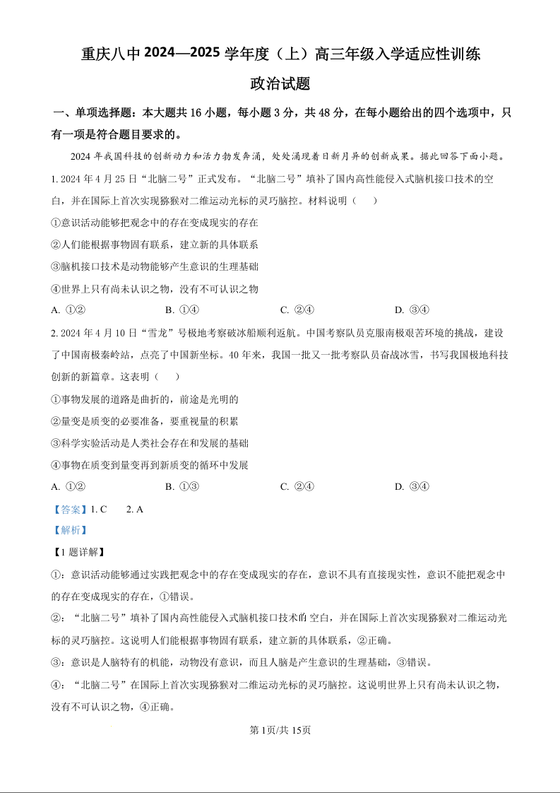 重庆市第八中学校2024-2025学年度(上)高三年级入学适应性训练政治试题(解析版)