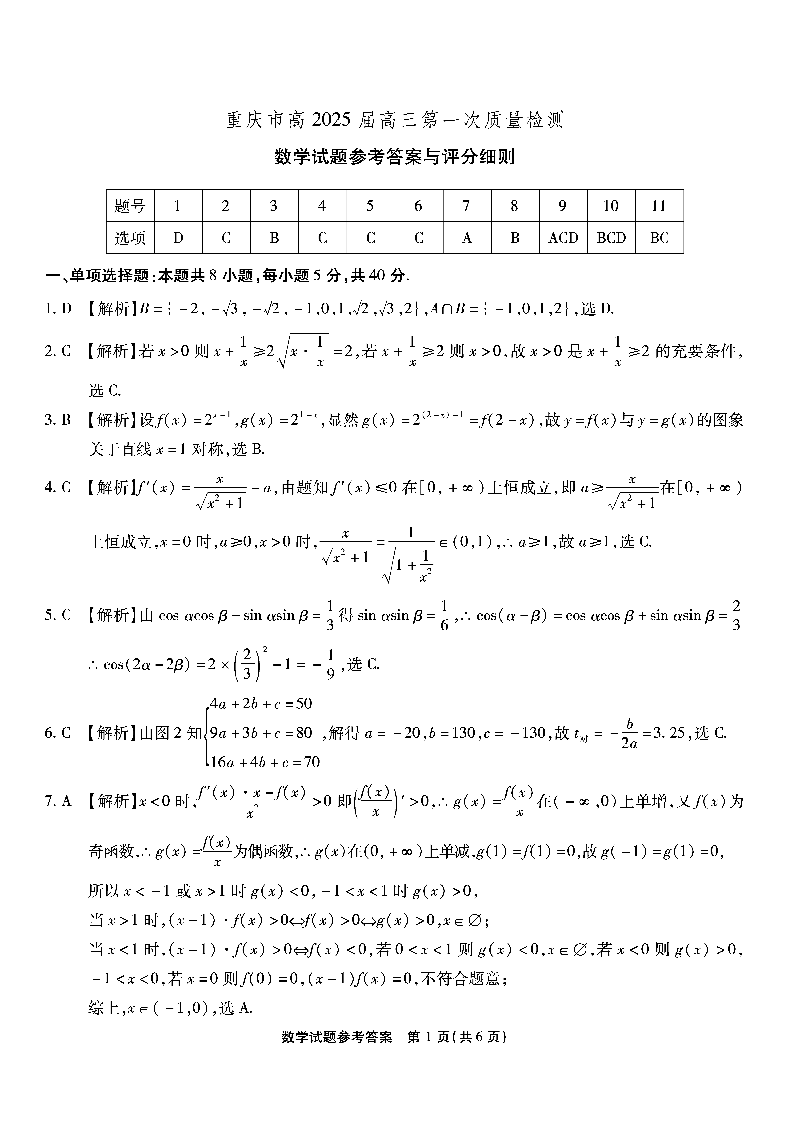 重庆市南开中学2025届高三第一次质量检测数学答案