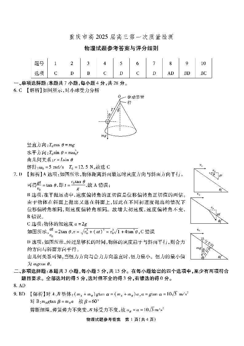 重庆市南开中学2025届高三第一次质量检测物理答案