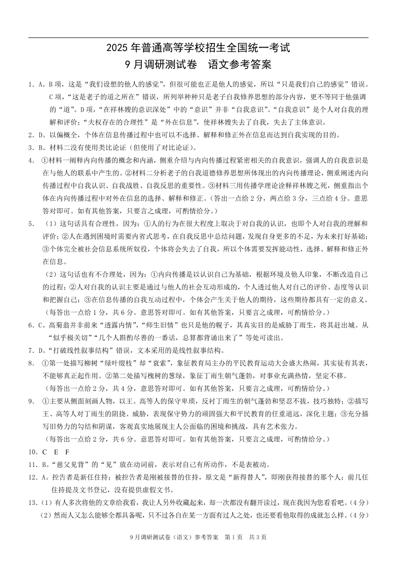 重庆康德2025年普通高中学业水平选择性考试9月调研测试卷语文答案