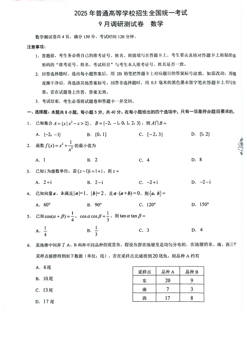重庆康德2025年普通高中学业水平选择性考试9月调研测试卷数学