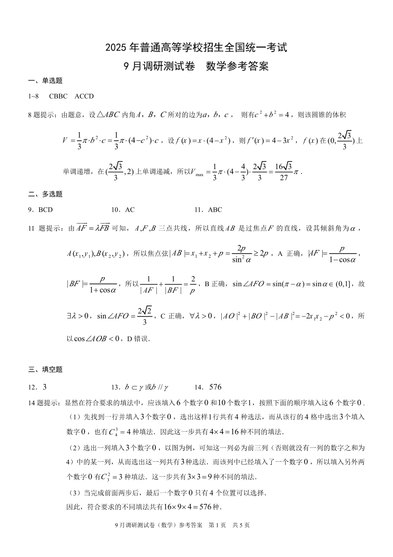重庆康德2025年普通高中学业水平选择性考试9月调研测试卷数学答案