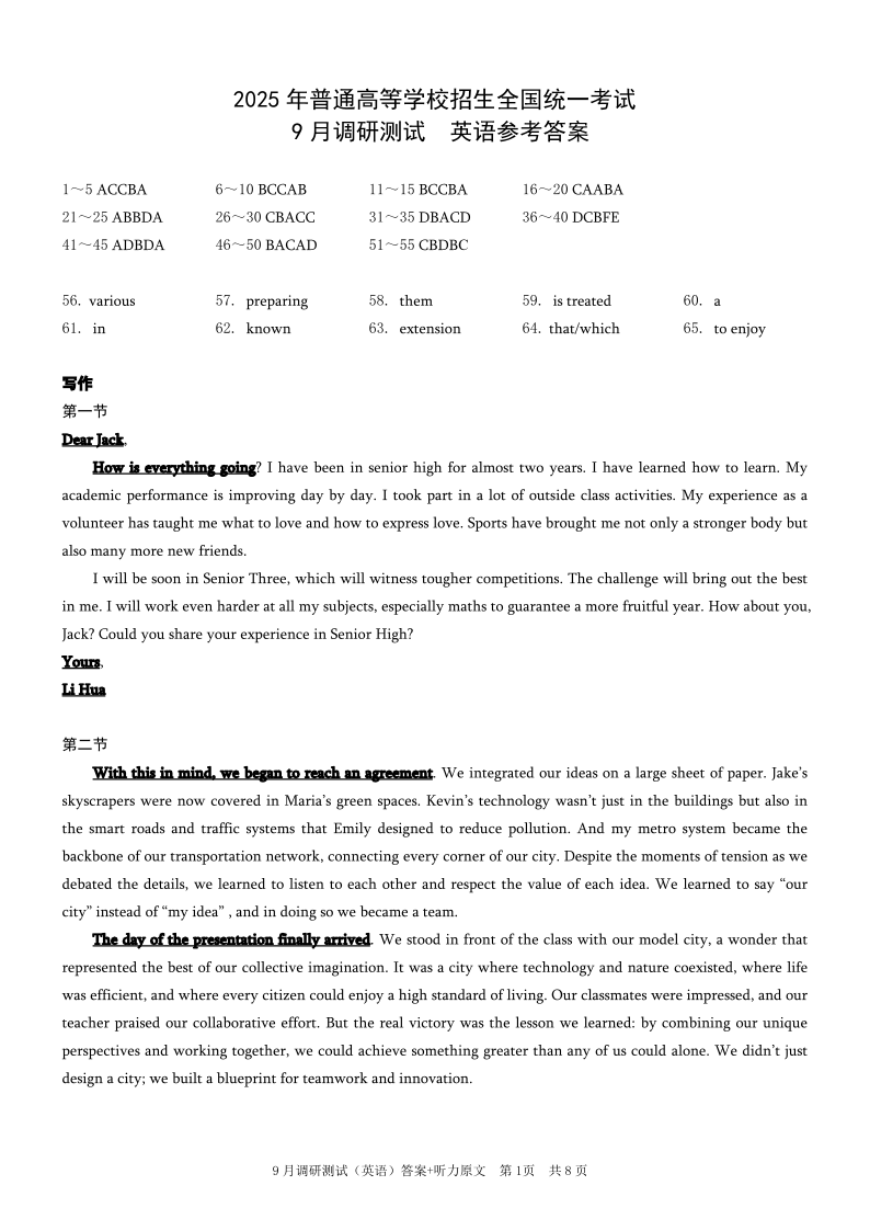 重庆康德2025年普通高中学业水平选择性考试9月调研测试卷英语答案