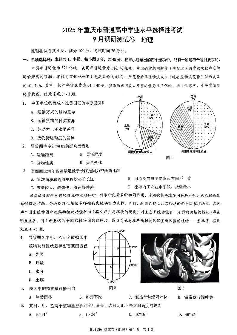 重庆康德2025年普通高中学业水平选择性考试9月调研测试卷地理