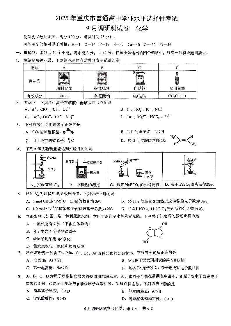 重庆康德2025年普通高中学业水平选择性考试9月调研测试卷化学