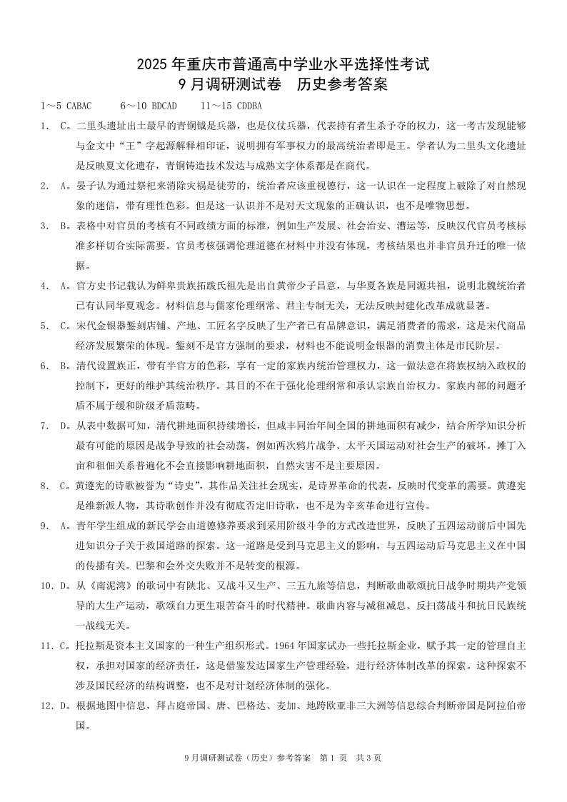 重庆康德2025年普通高中学业水平选择性考试9月调研测试卷历史答案