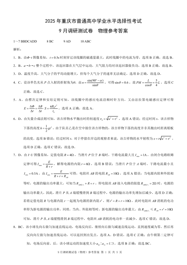 重庆康德2025年普通高中学业水平选择性考试9月调研测试卷物理答案