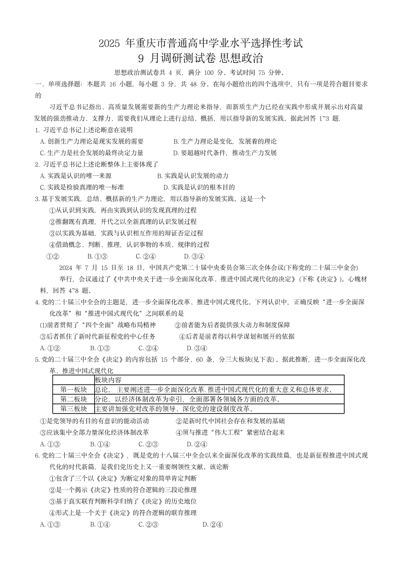 重庆康德2025年普通高中学业水平选择性考试9月调研测试卷政治