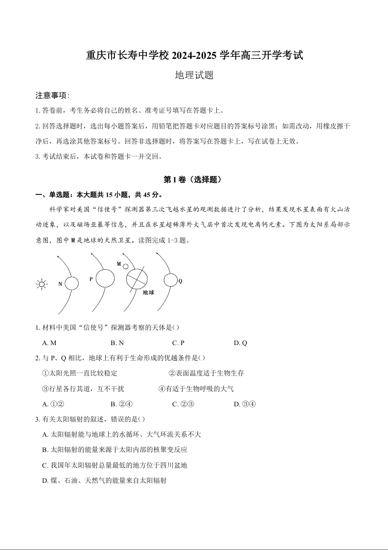 重庆市长寿中学校2024-2025学年高三开学考试地理+答案