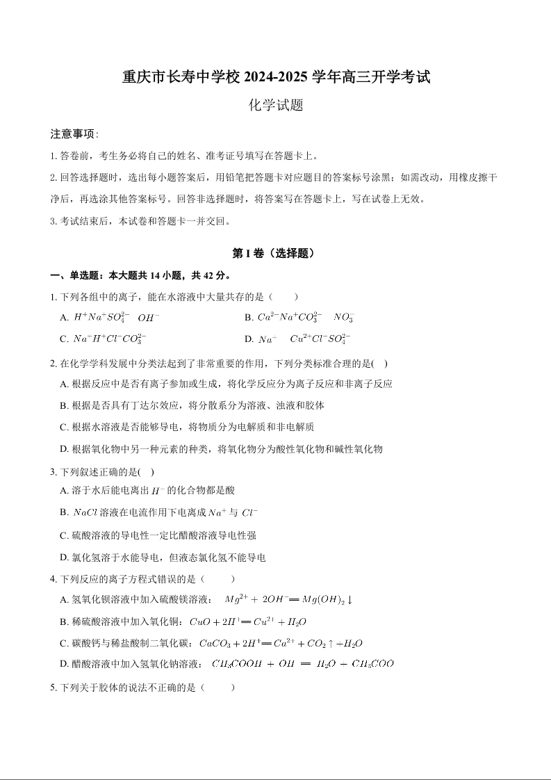 重庆市长寿中学校2024-2025学年高三开学考试化学+答案