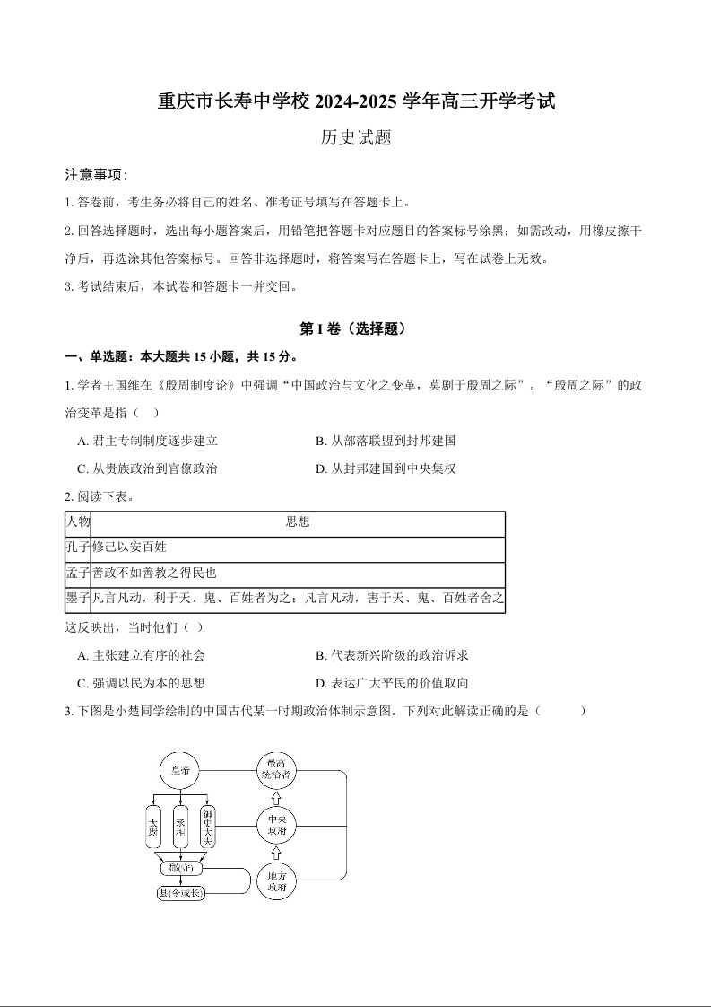 重庆市长寿中学校2024-2025学年高三开学考试历史+答案