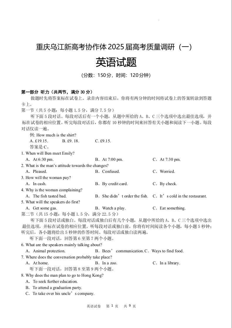 重庆市重庆乌江新高考协作体2025届高考质量调研(一)英语