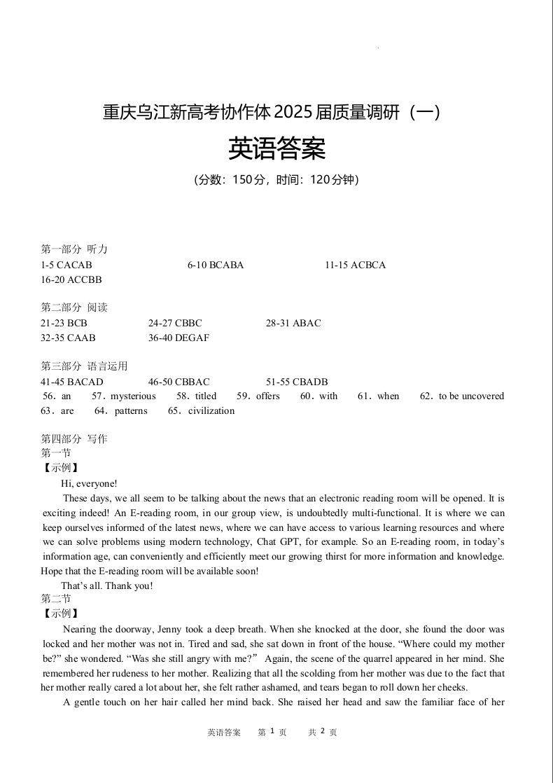 重庆市重庆乌江新高考协作体2025届高考质量调研(一)英语答案