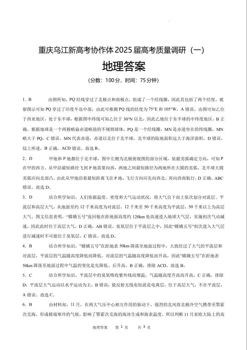 重庆市重庆乌江新高考协作体2025届高考质量调研(一)地理答案