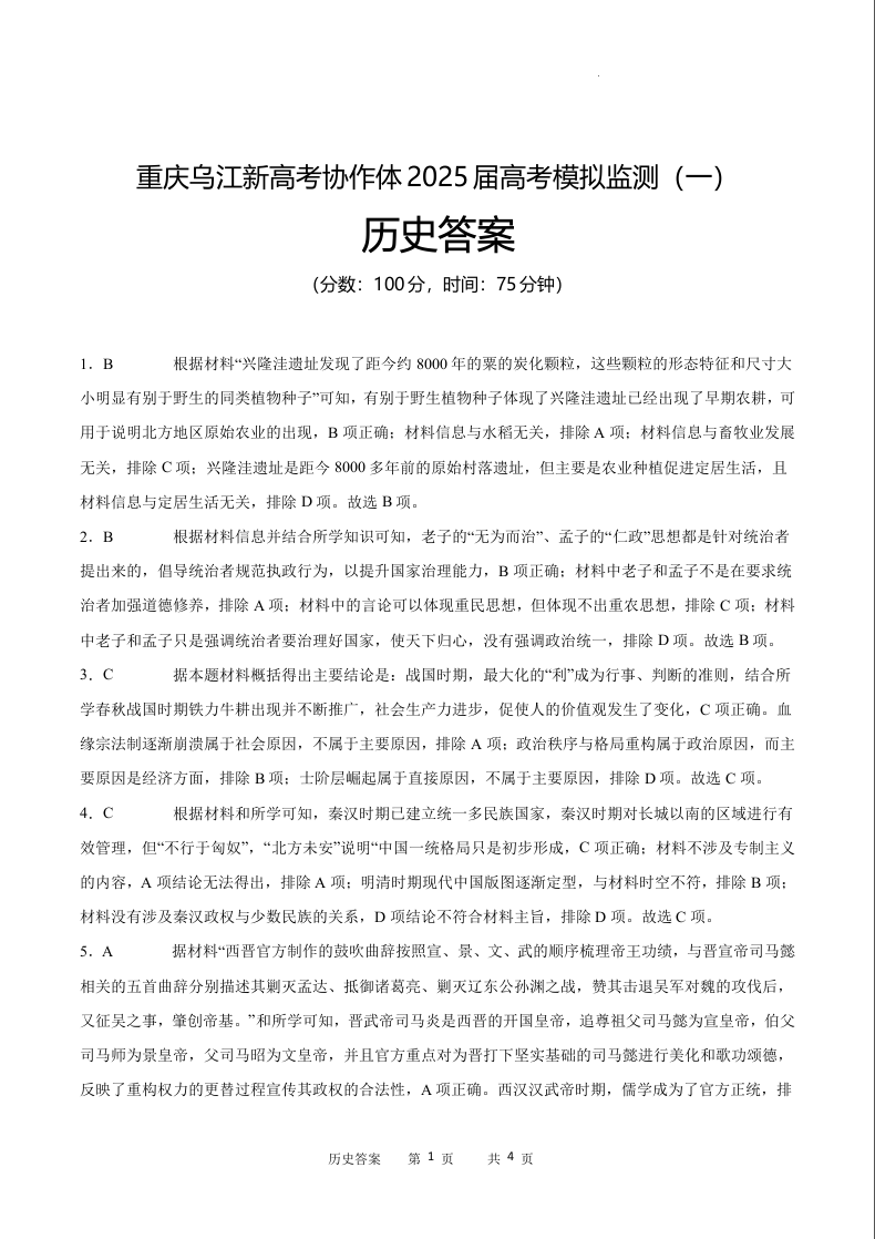 重庆市重庆乌江新高考协作体2025届高考质量调研(一)历史答案