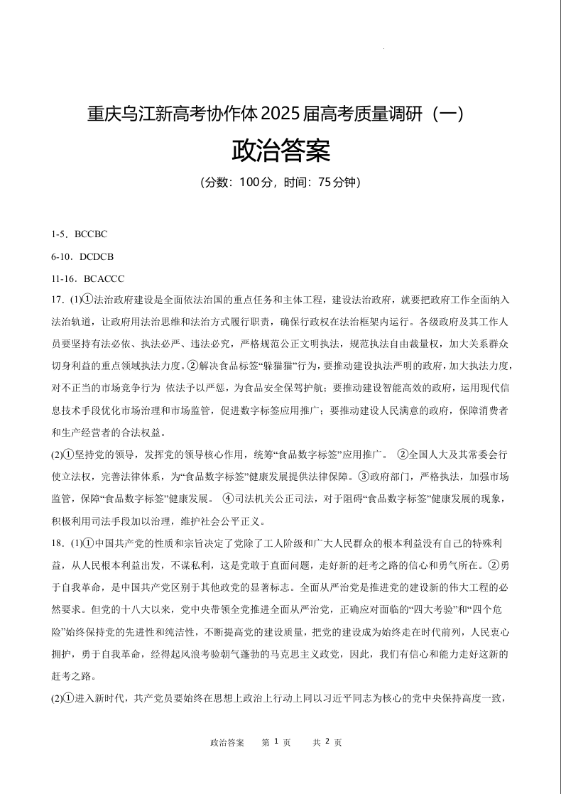 重庆市重庆乌江新高考协作体2025届高考质量调研(一)政治答案