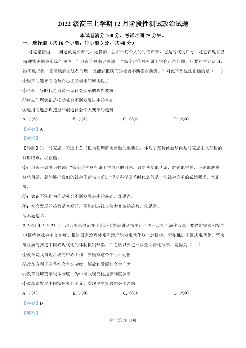 四川省成都市树德中学2025届高三上学期12月月考政治答案